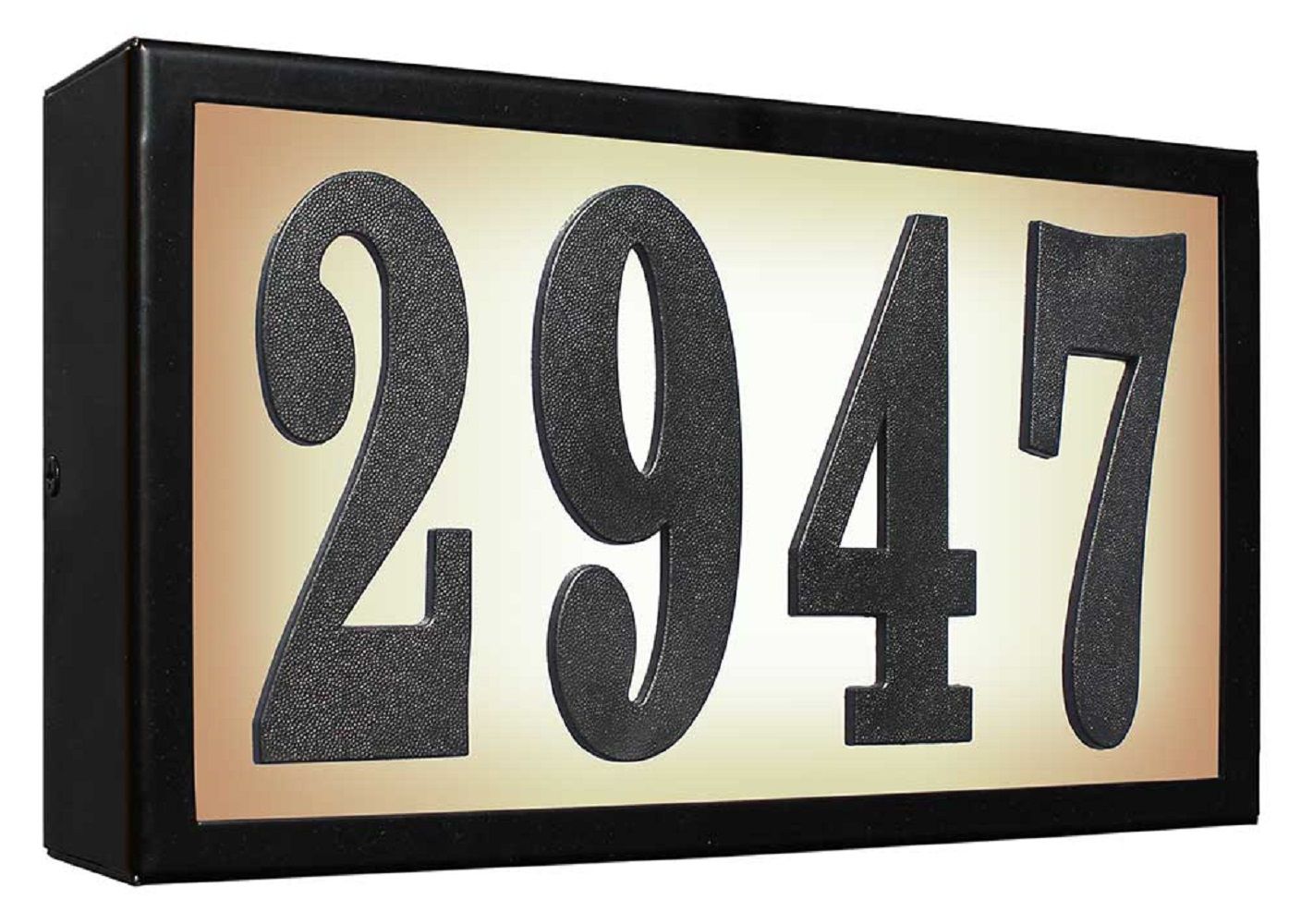 Serrano (Standard) lighted address plaque features a galvanized steel frame with a tough color powder coat finish. Plaque can be seen up to 100 feet away at night and comes with 4″ black polymer numbers 0-9 twice and tube of adhesive glue in the box. The plaque can be ordered with custom vinyl numbers OR 4″ Cast Aluminum numbers that match the frame color can be ordered for an additional cost. Low voltage, plaque runs between 15 – 18 volts and can plug into your existing doorbell transformer. A set of bulbs are included with 3 feet of low voltage wiring. A low voltage hardwire or plug-in transformer are also available and sold separately.