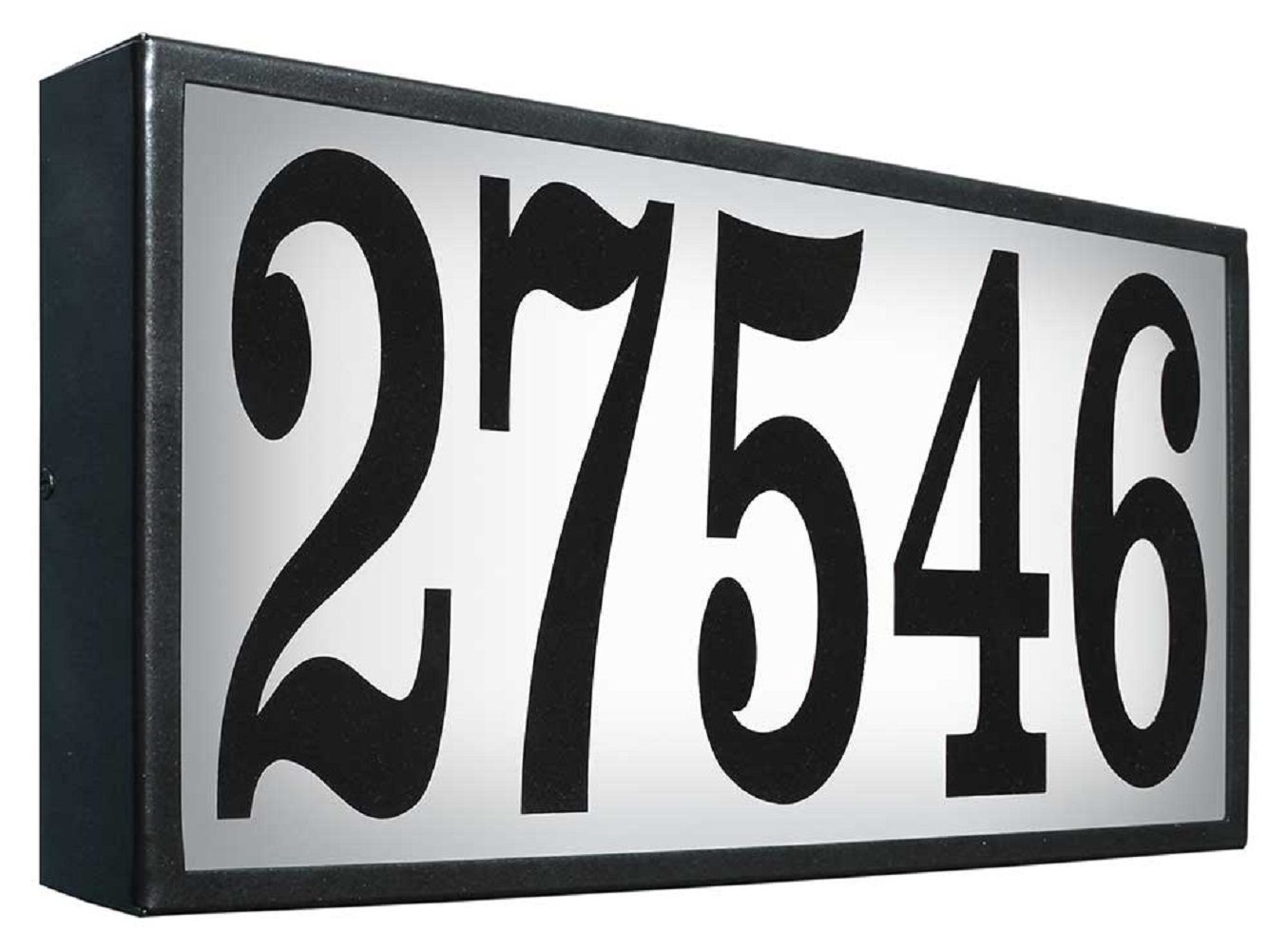 Serrano (XTRA LARGE) lighted address plaque with LED lights features a galvanized steel frame with a tough black color powder coat finish. LED lights give a whiter and brighter look when lite up at night. Plaque can be seen up to 100 feet away at night and fits up to five 6″ black vinyl numbers. Low voltage, plaque runs approx 18 volts and can plug into your existing doorbell transformer. LED bulbs ( are included with 3 feet of low voltage wiring. A low voltage hardwire or plug-in transformer are also available and sold separately.