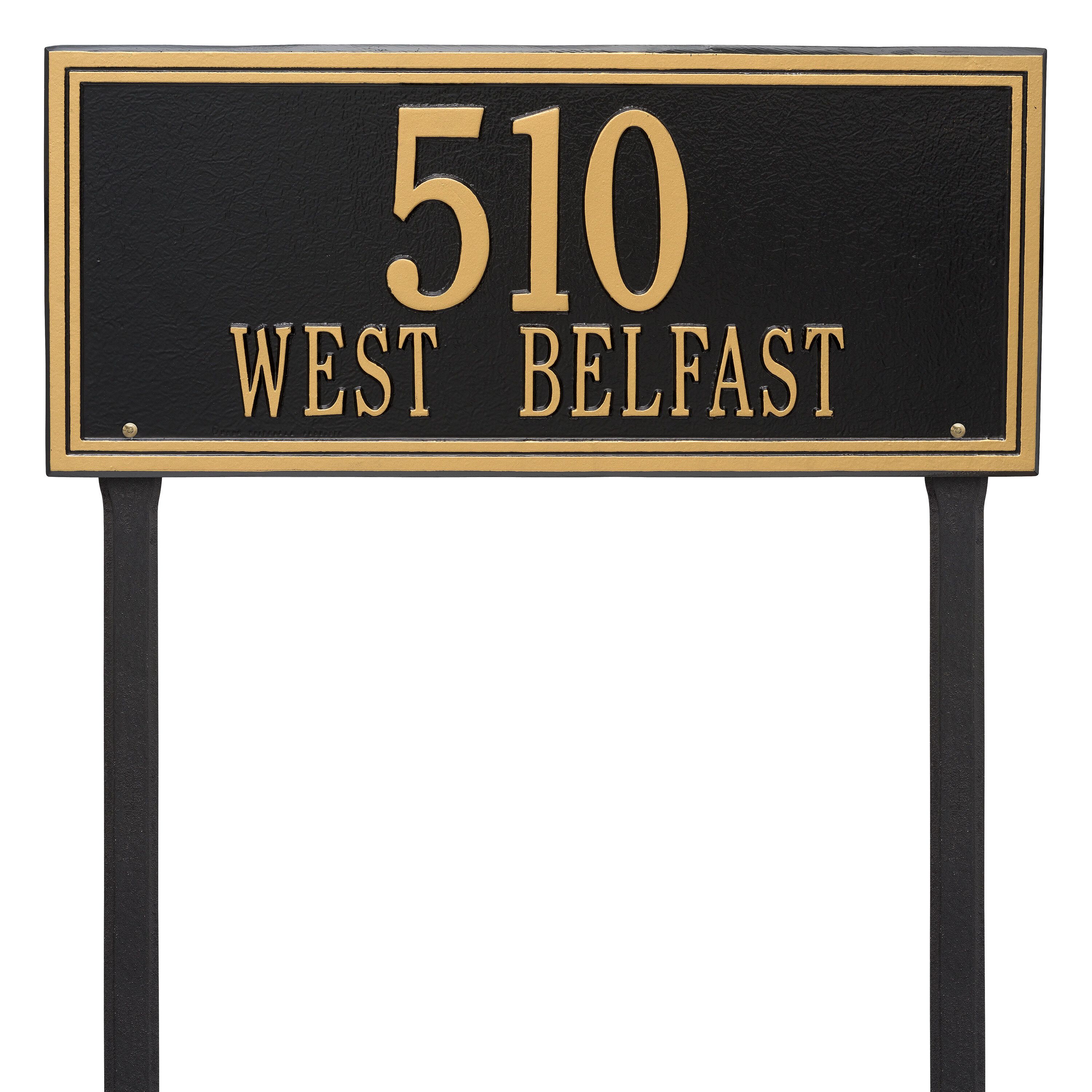 The uniquely designed personalized Whitehall Double Line Standard Lawn Address Sign - One Line is available in multiple finish options with customized lettering.